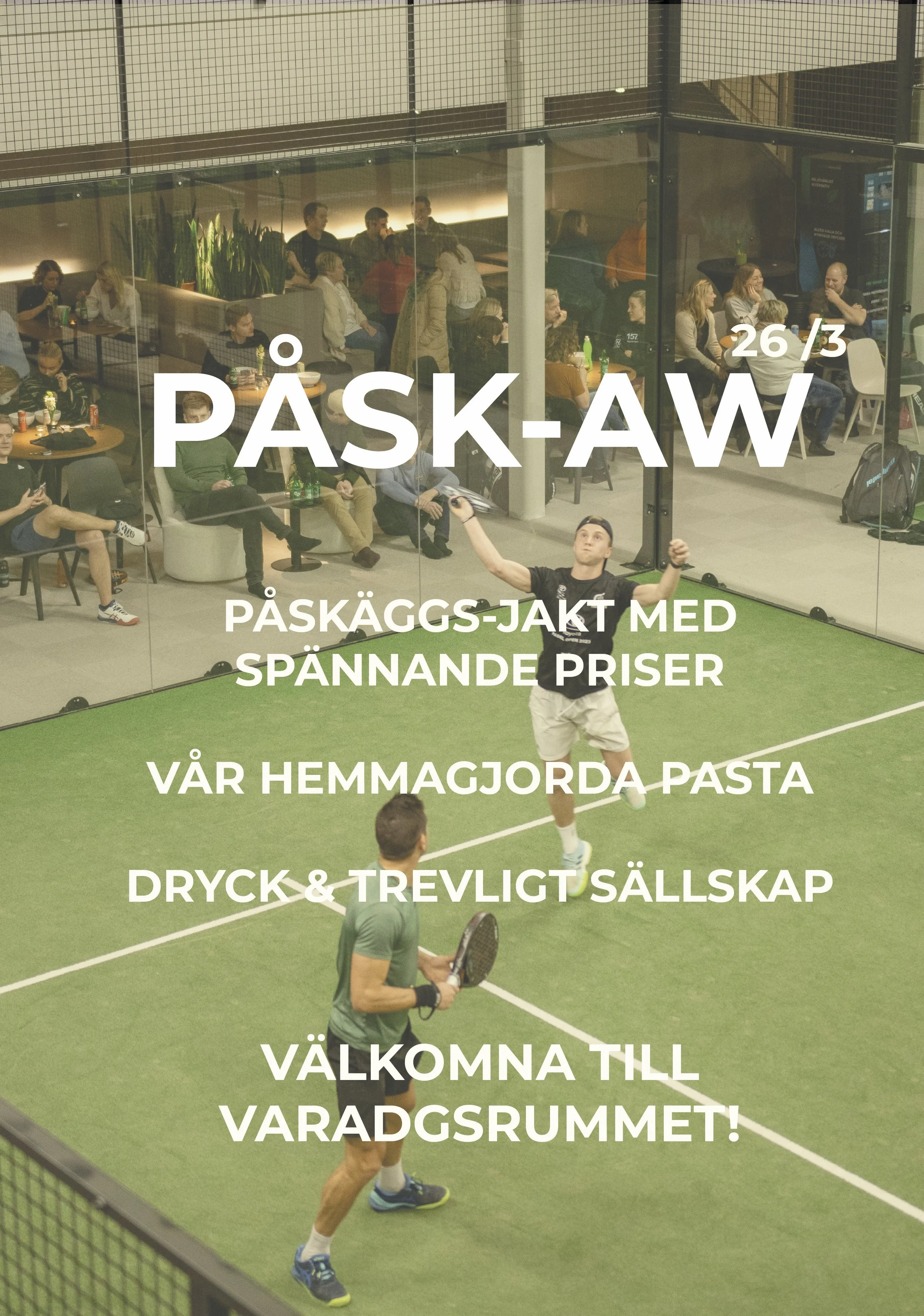 Den 26/3 bjuder vi in till PÅSK-AW. God mat, dryck, padelturneringar & PÅSKÄGGSJAKT . Medlem som inte medlem, alla är välkomna, det är öppet hus från 17.00 Förbeställ din mat via instagram eller länken nedan och läs mer nedan.